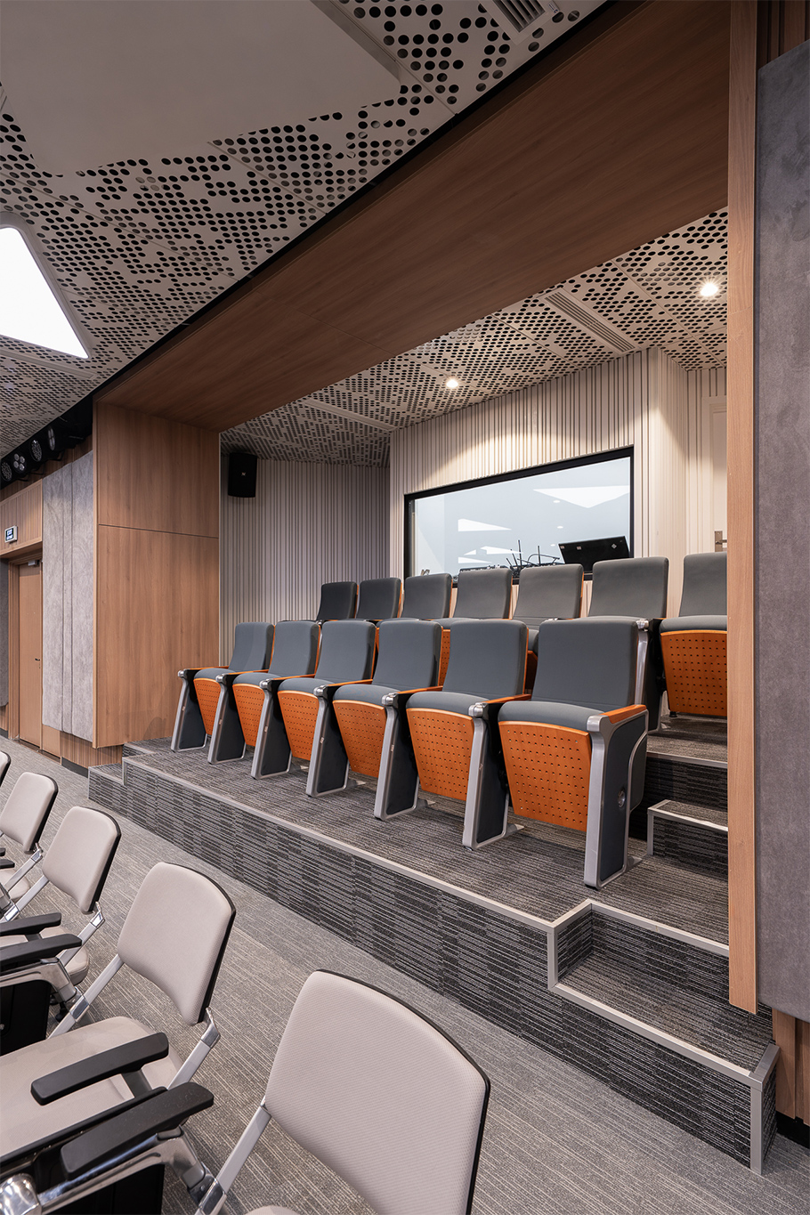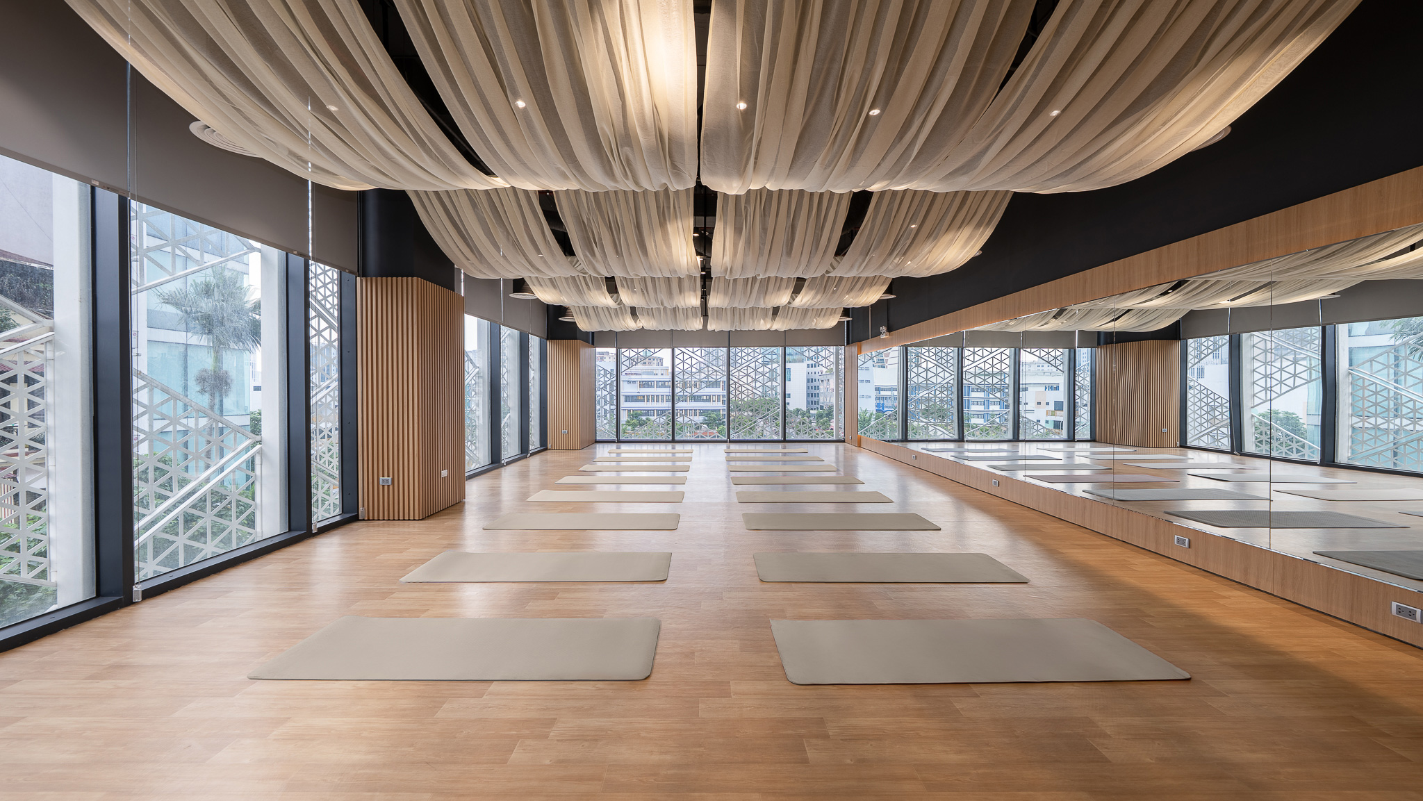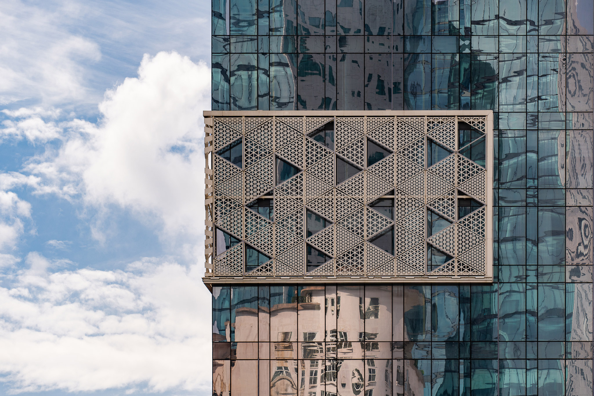 Sử dụng hệ double skin nhôm, được khai thác và phát triển từ nhận diện thương hiệu của tập đoàn để tạo nên sự tương phản giữa khối đế và khối tháp của tòa nhà. Các tấm CNC này được ứng dụng lặp đi lặp lại có chức năng trang trí đồng thời giúp kiểm soát ánh sáng và tạo sự riêng tư cho không gian bên trong.