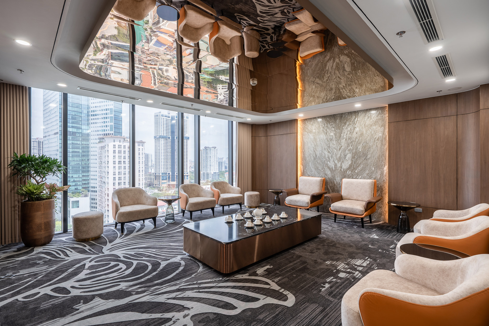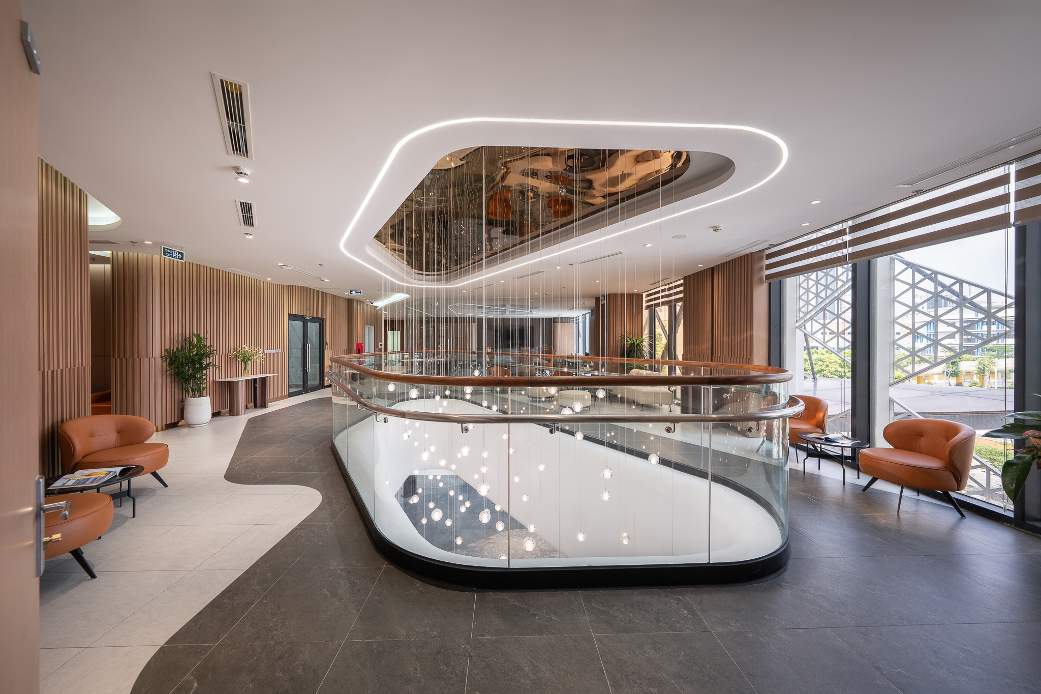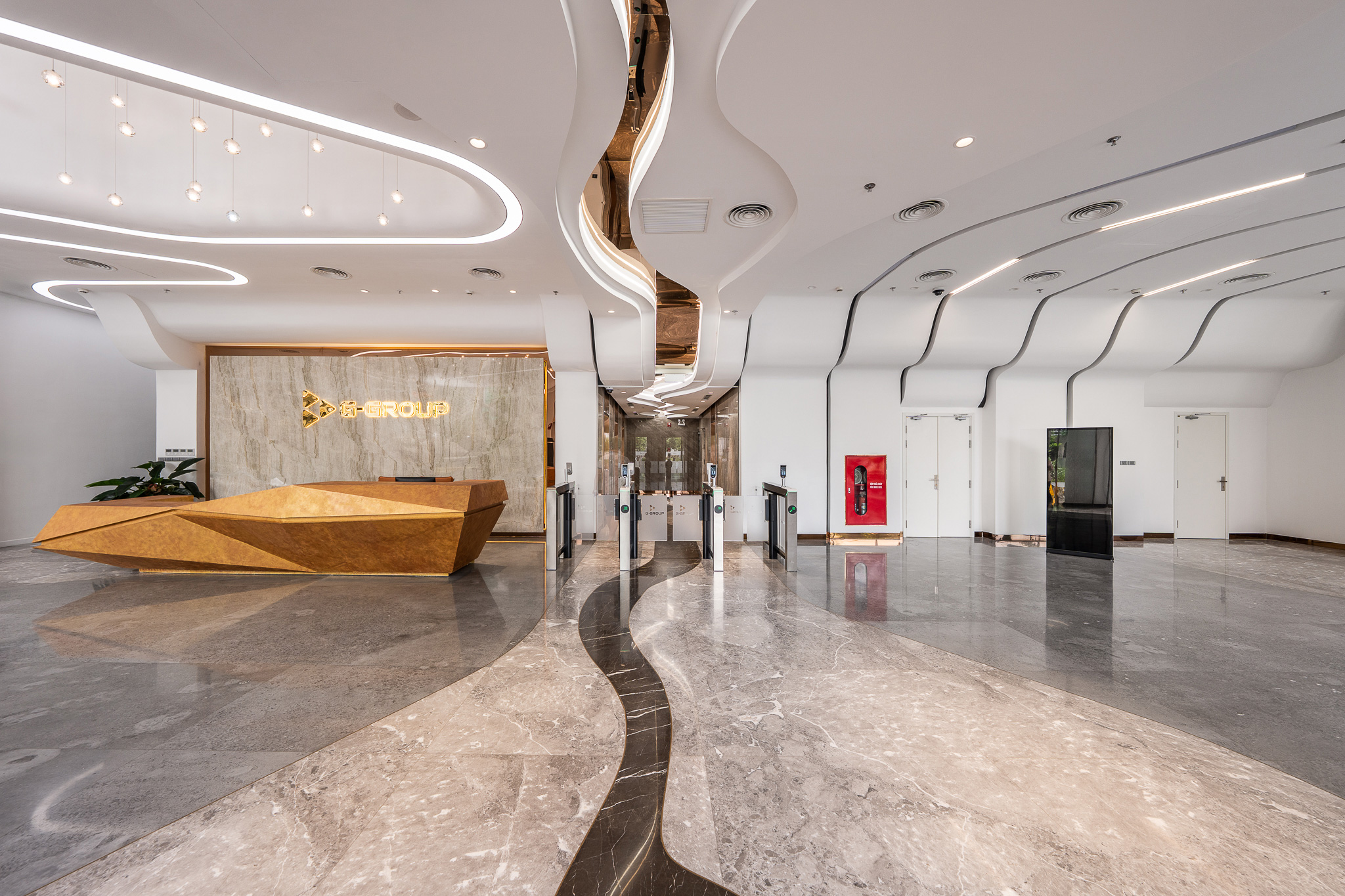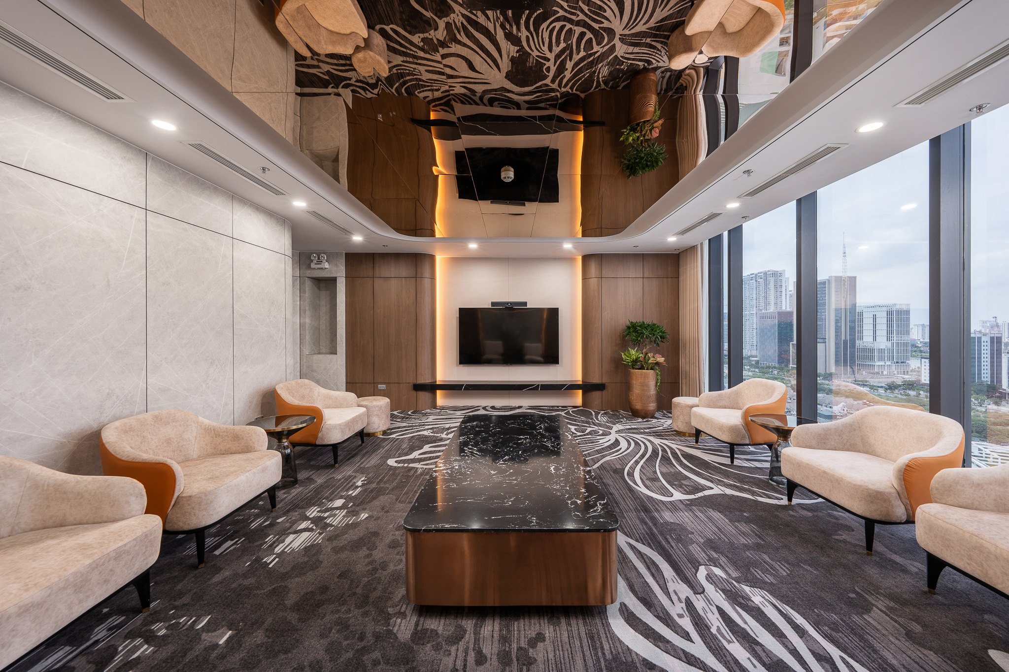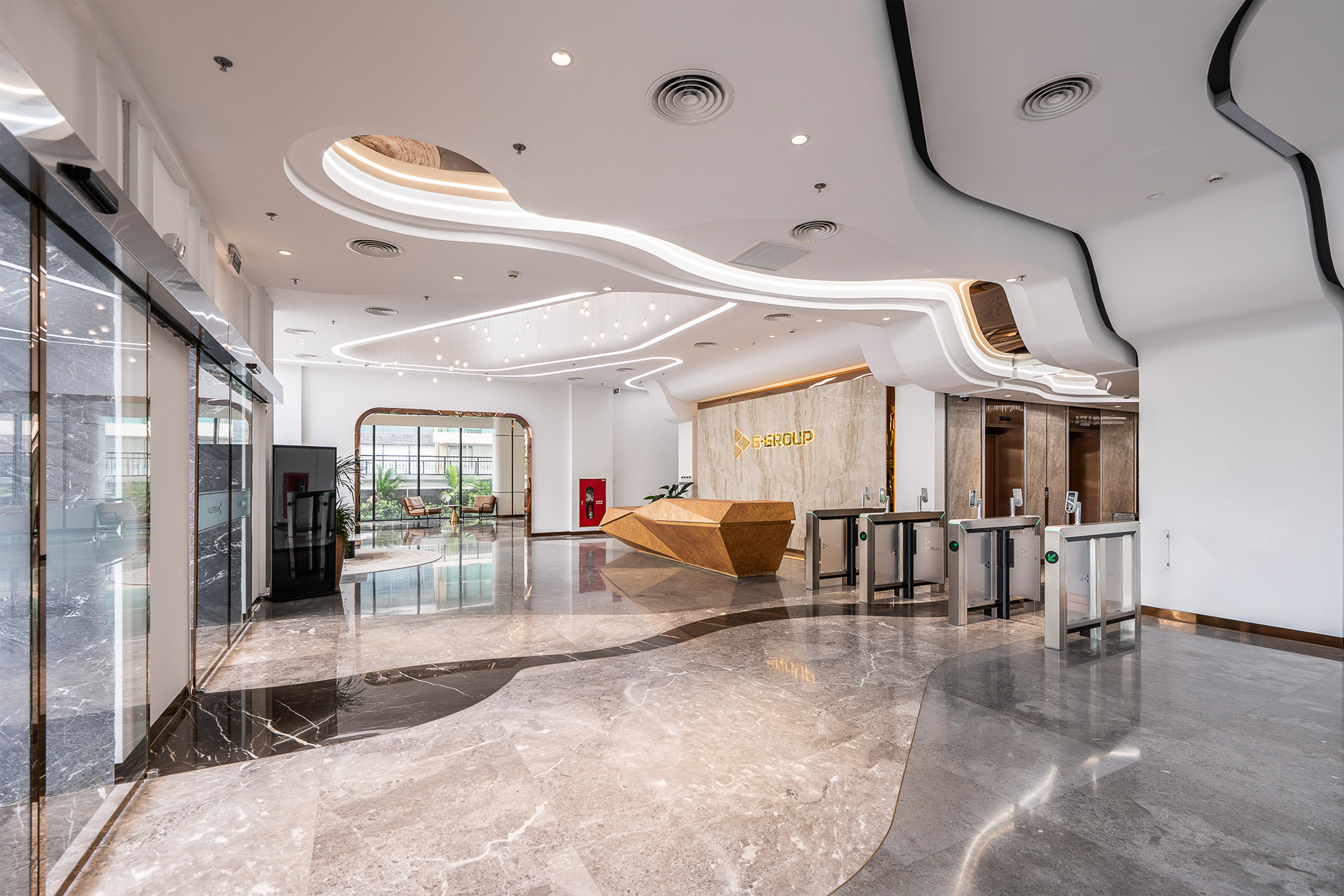 Concept nhấn mạnh sự phát triển liên tục và đồng bộ, đại diện cho một tập đoàn đa ngành công nghệ, tài chính và truyền thông hàng đầu. Hệ thống họa tiết được phát triển từ logo và cách tạo hình geometric được ứng dụng xuyên suốt trong tạo hình đồ nội thất, hệ trần, tấm tiêu âm, wayfinding tòa nhà… Sự nhắc lại các yếu tố thiết kế từ ngoại thất đến nội thất tạo nên liên kết thị giác, nhịp điệu cho không gian.