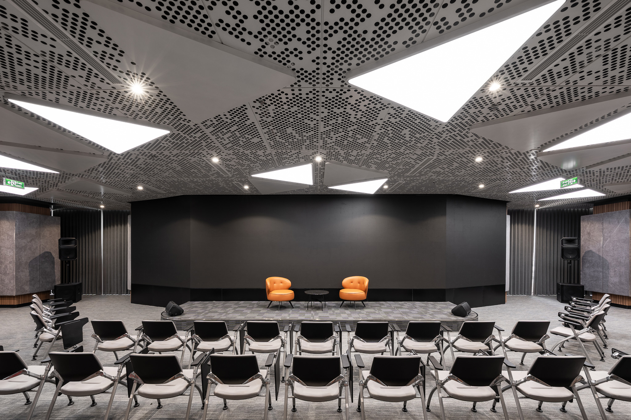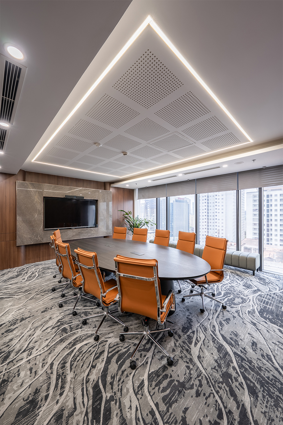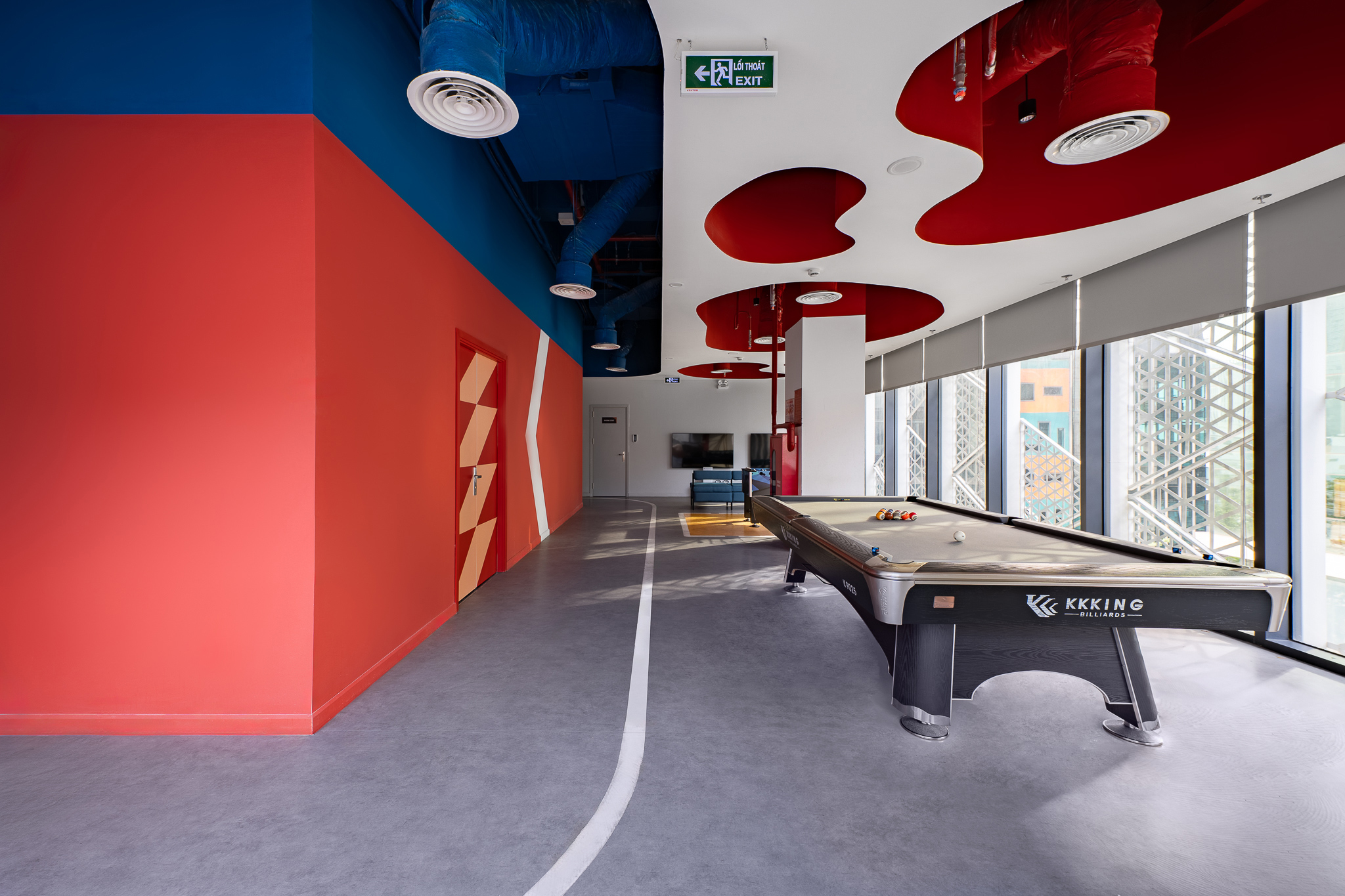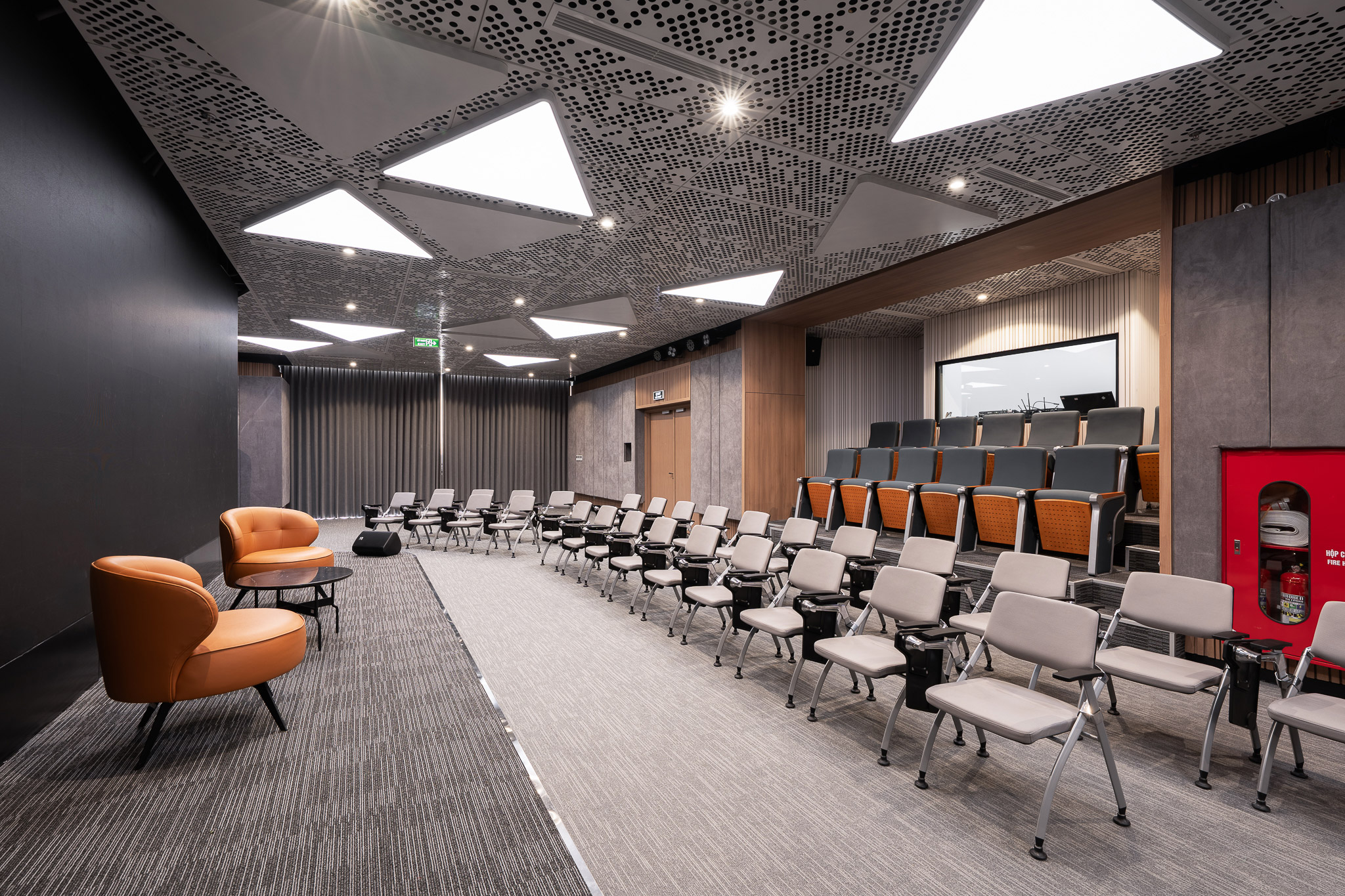 Concept nhấn mạnh sự phát triển liên tục và đồng bộ, đại diện cho một tập đoàn đa ngành công nghệ, tài chính và truyền thông hàng đầu. Hệ thống họa tiết được phát triển từ logo và cách tạo hình geometric được ứng dụng xuyên suốt trong tạo hình đồ nội thất, hệ trần, tấm tiêu âm, wayfinding tòa nhà… Sự nhắc lại các yếu tố thiết kế từ ngoại thất đến nội thất tạo nên liên kết thị giác, nhịp điệu cho không gian.