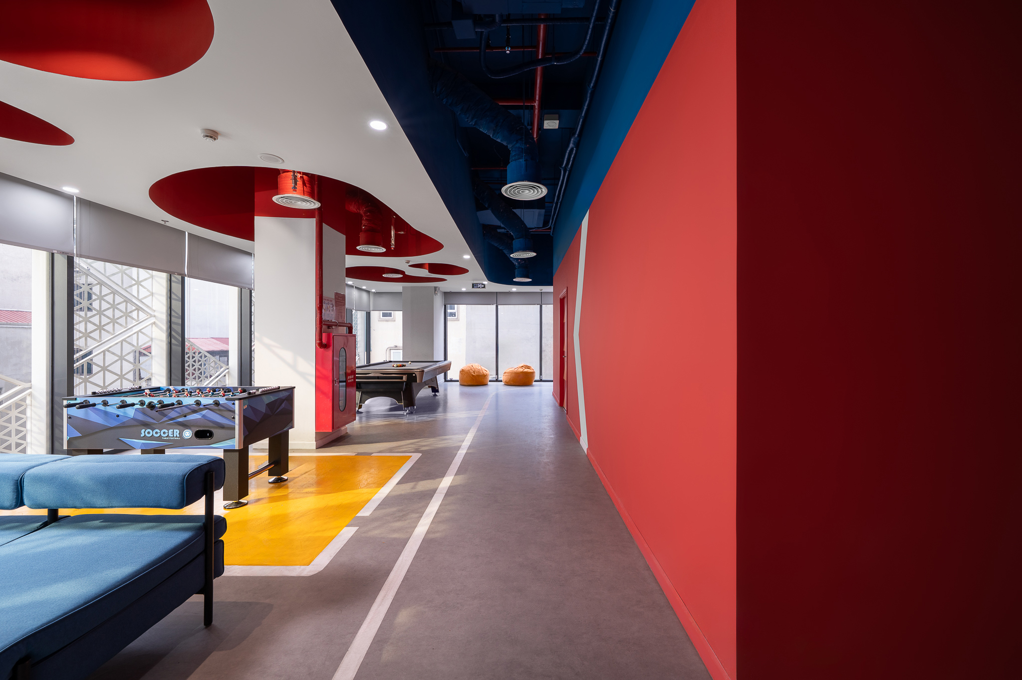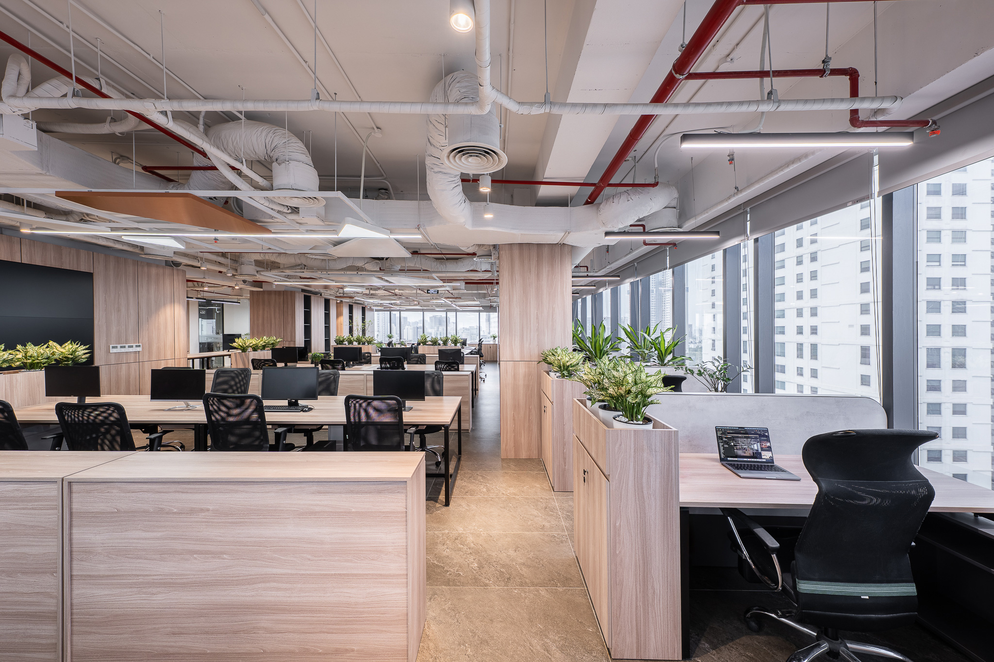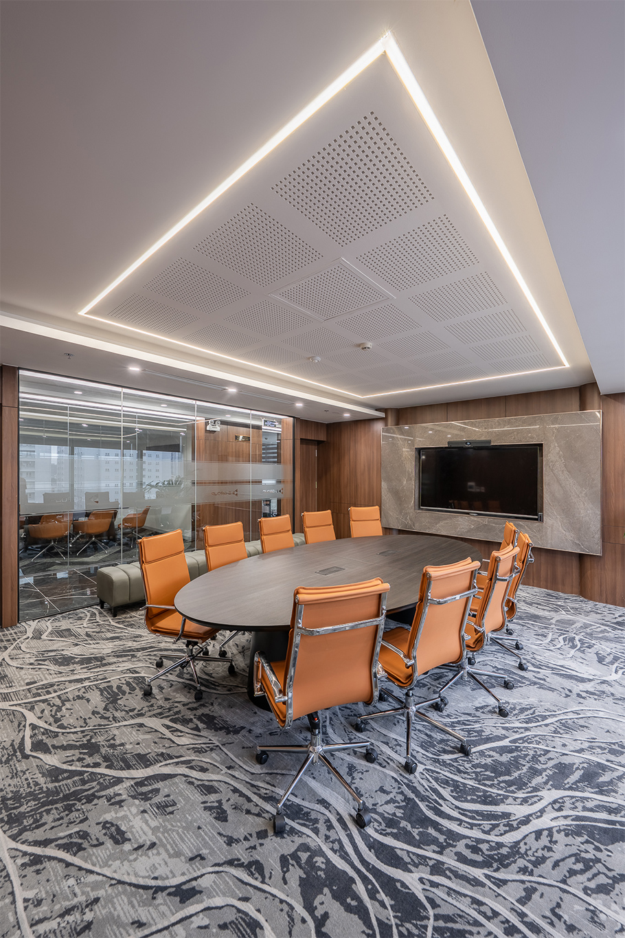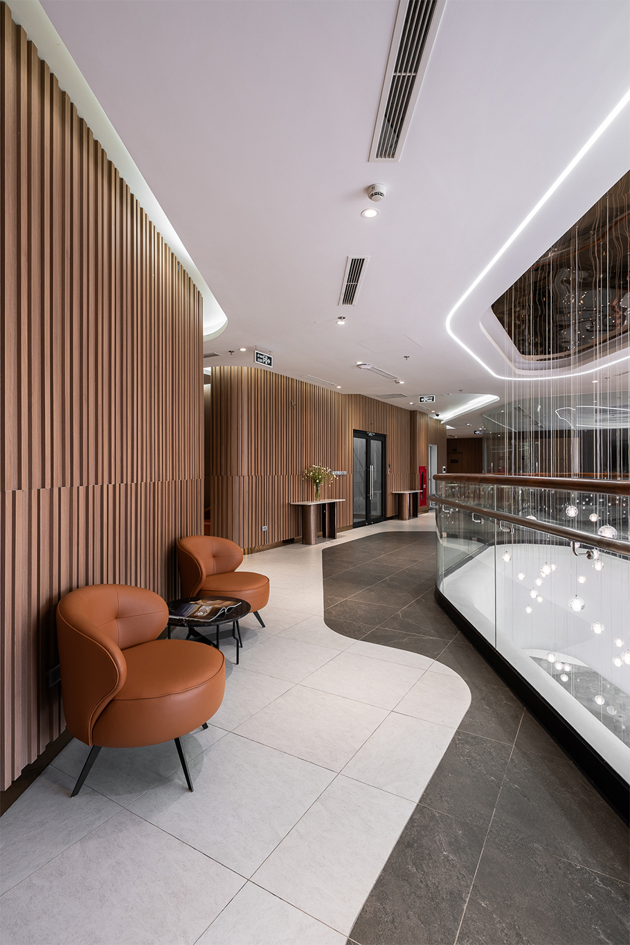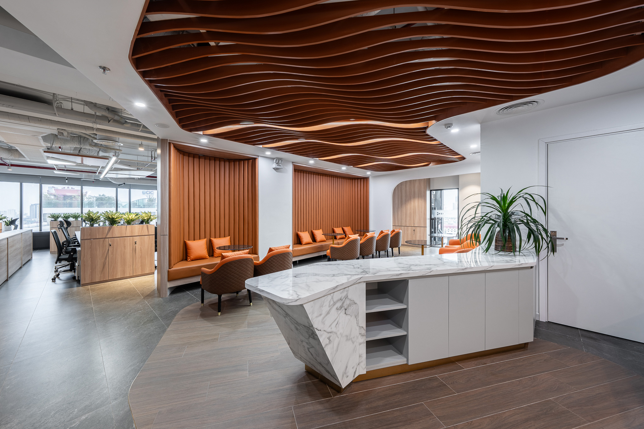 Concept nhấn mạnh sự phát triển liên tục và đồng bộ, đại diện cho một tập đoàn đa ngành công nghệ, tài chính và truyền thông hàng đầu. Hệ thống họa tiết được phát triển từ logo và cách tạo hình geometric được ứng dụng xuyên suốt trong tạo hình đồ nội thất, hệ trần, tấm tiêu âm, wayfinding tòa nhà… Sự nhắc lại các yếu tố thiết kế từ ngoại thất đến nội thất tạo nên liên kết thị giác, nhịp điệu cho không gian.