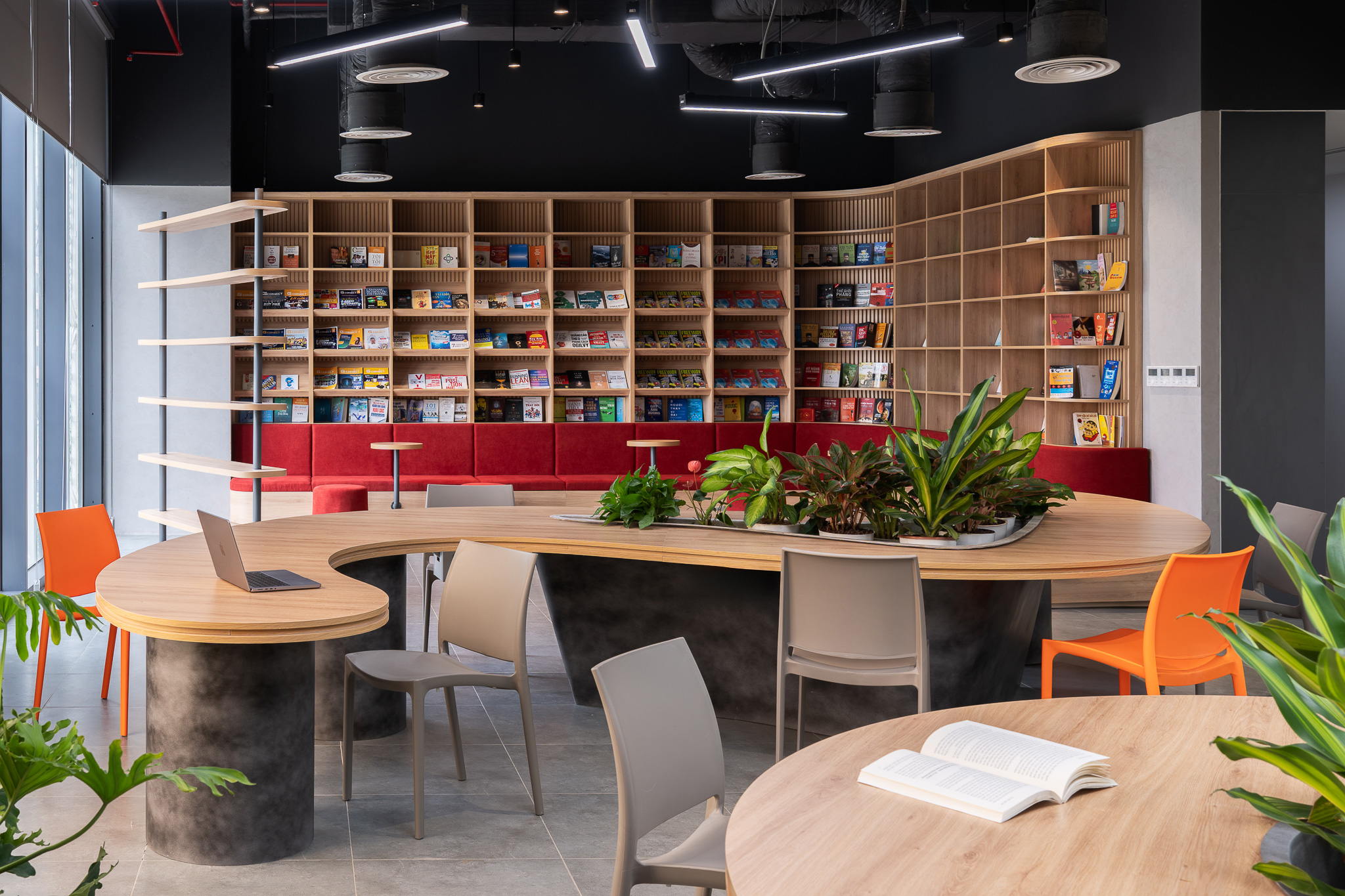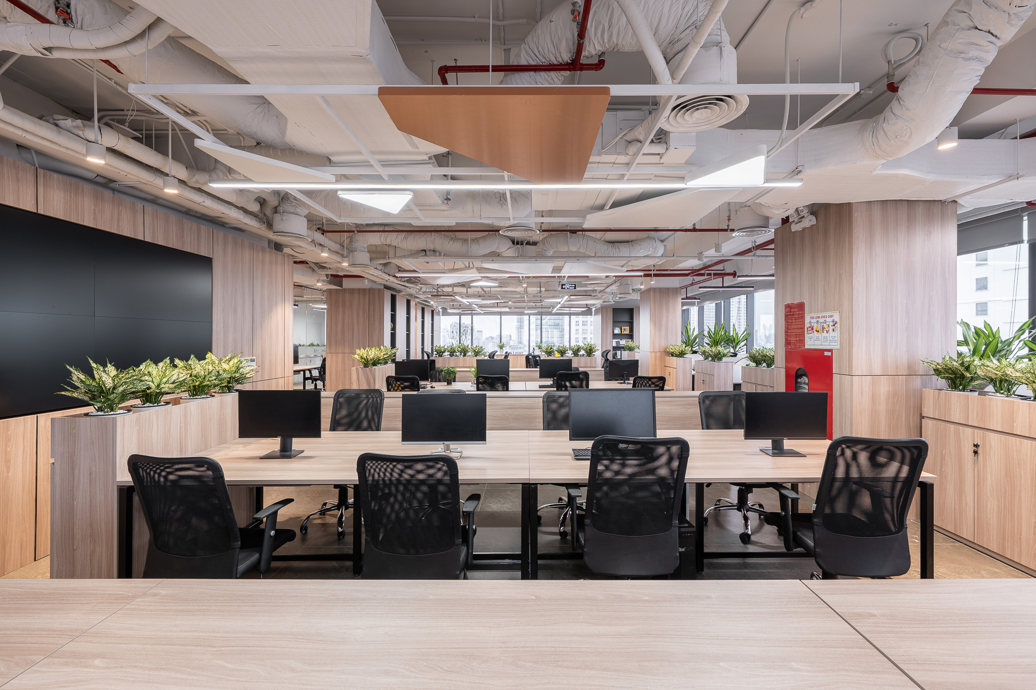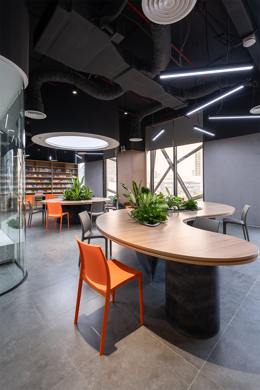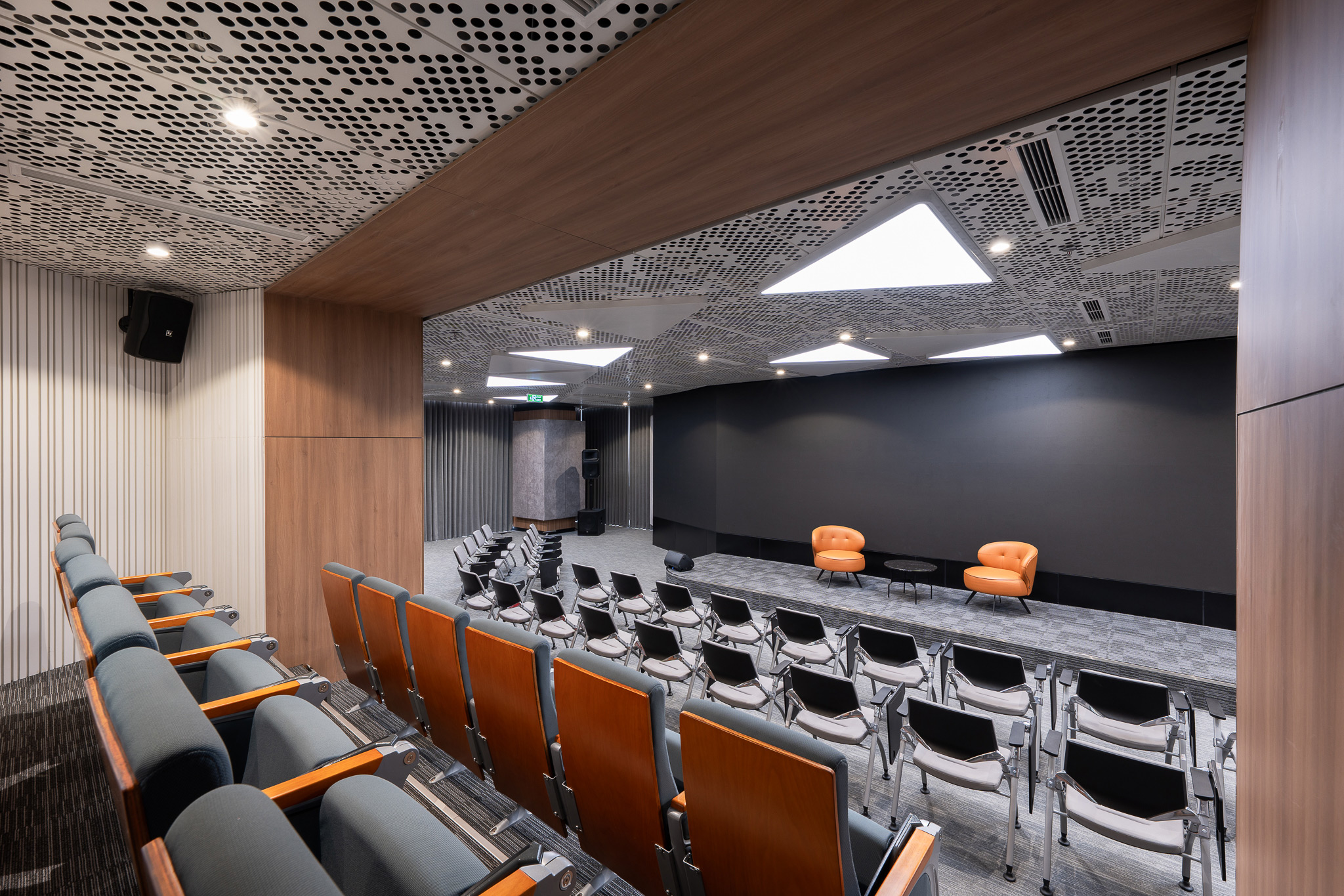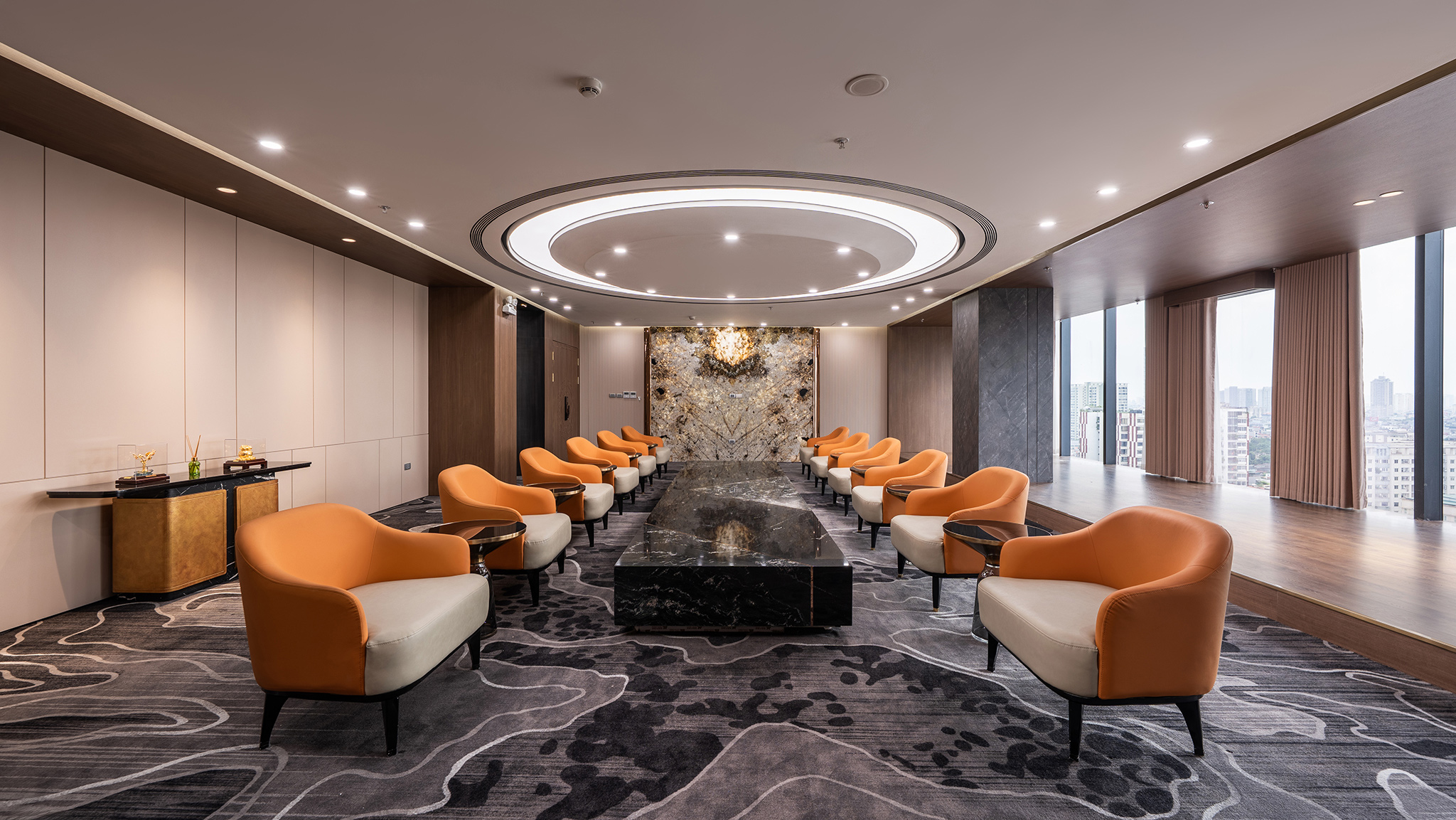 Concept nhấn mạnh sự phát triển liên tục và đồng bộ, đại diện cho một tập đoàn đa ngành công nghệ, tài chính và truyền thông hàng đầu. Hệ thống họa tiết được phát triển từ logo và cách tạo hình geometric được ứng dụng xuyên suốt trong tạo hình đồ nội thất, hệ trần, tấm tiêu âm, wayfinding tòa nhà… Sự nhắc lại các yếu tố thiết kế từ ngoại thất đến nội thất tạo nên liên kết thị giác, nhịp điệu cho không gian.