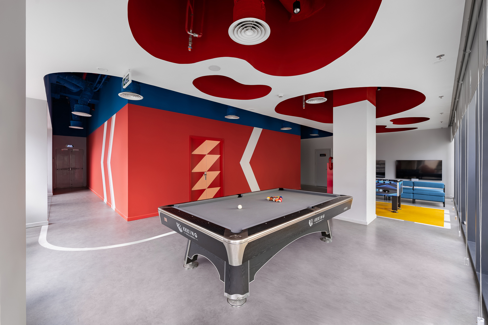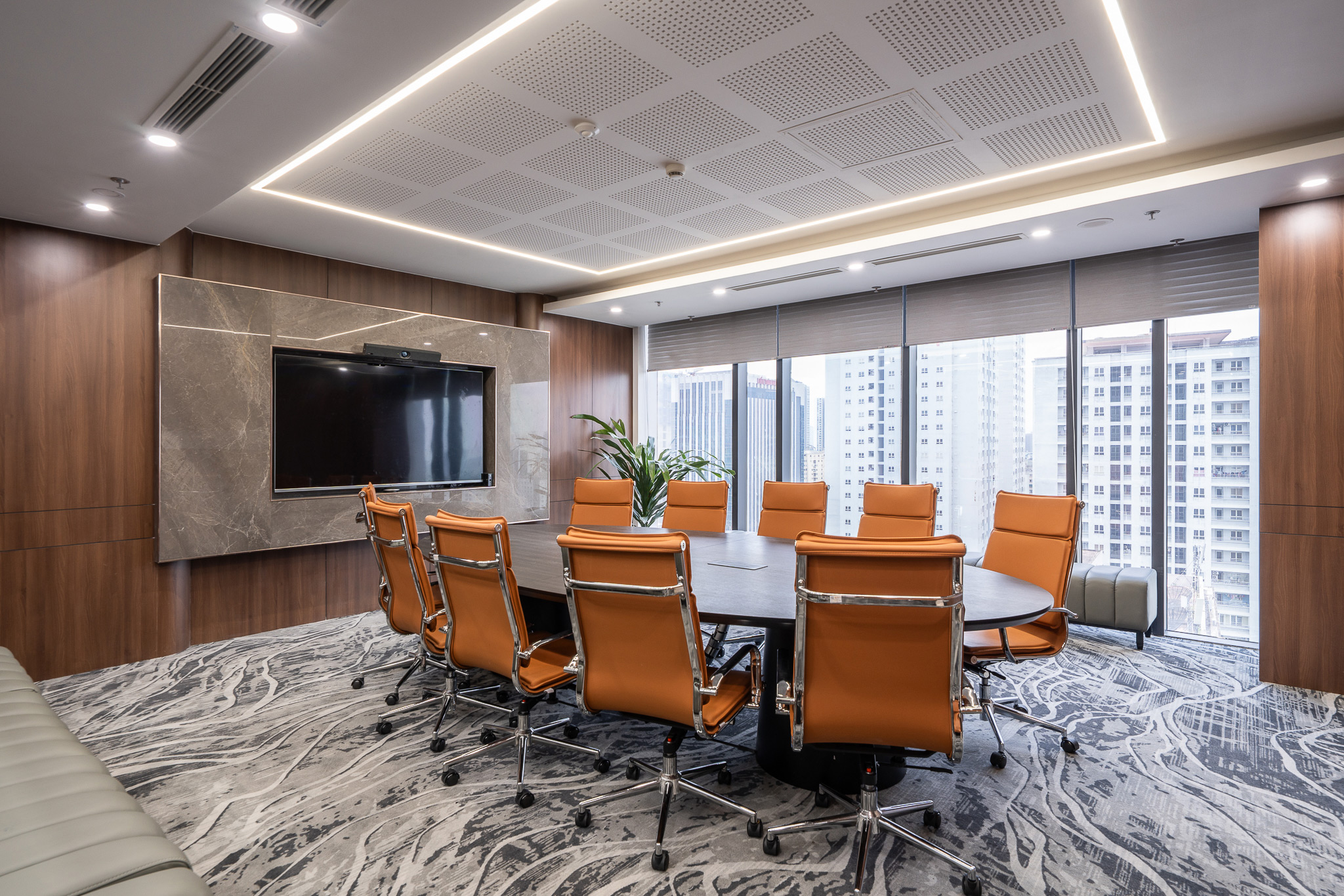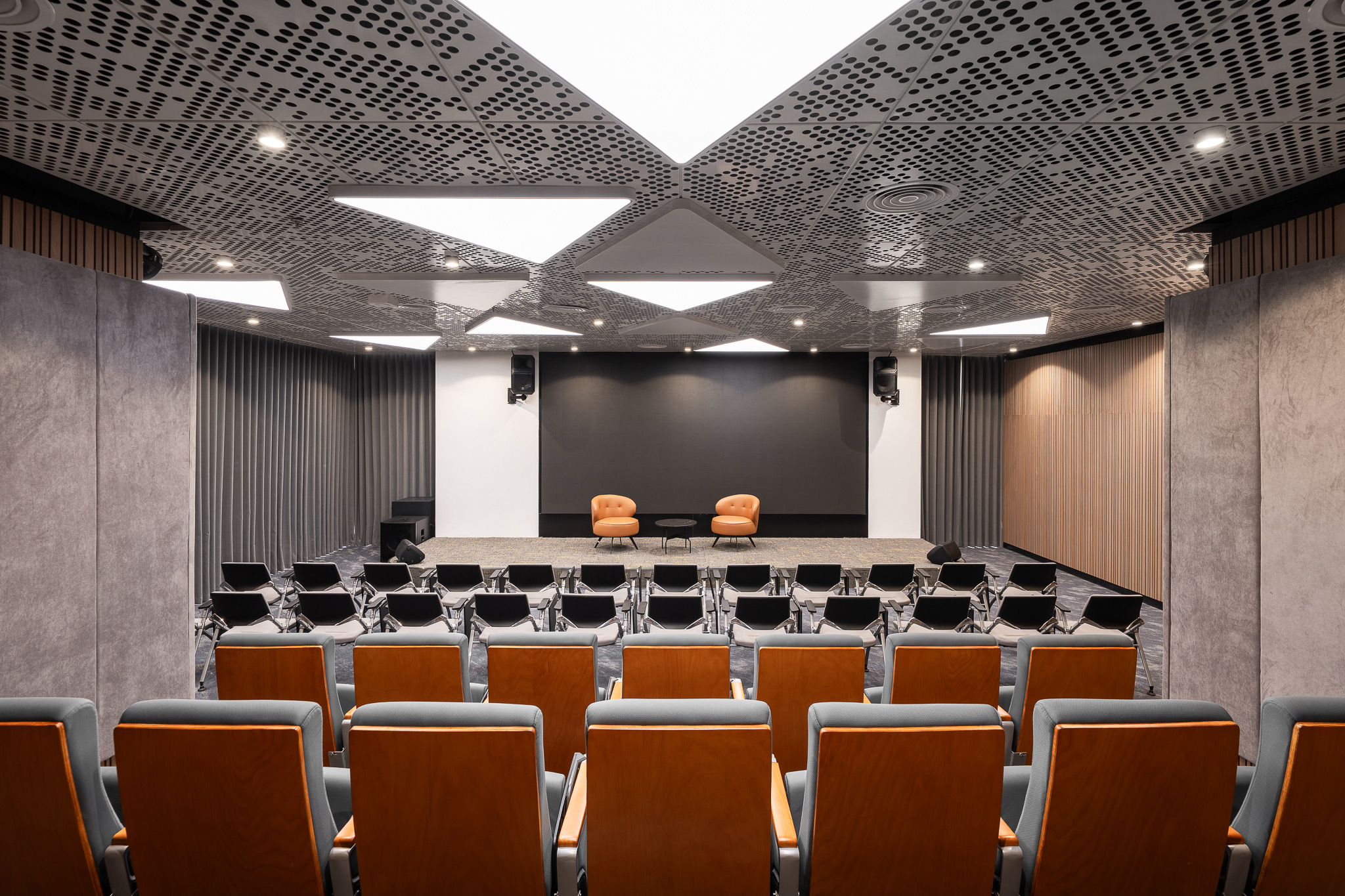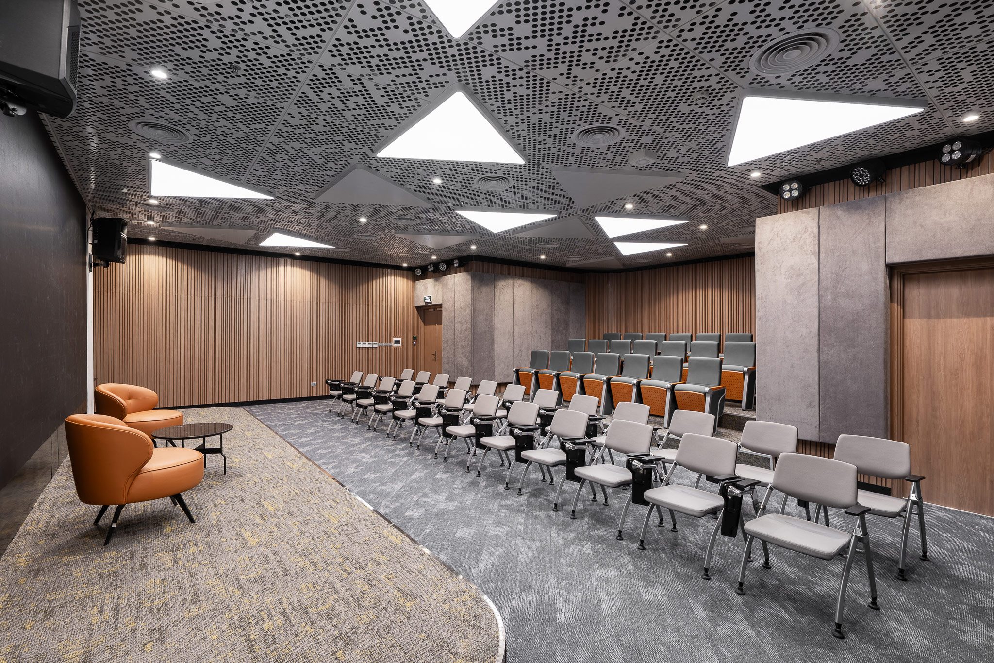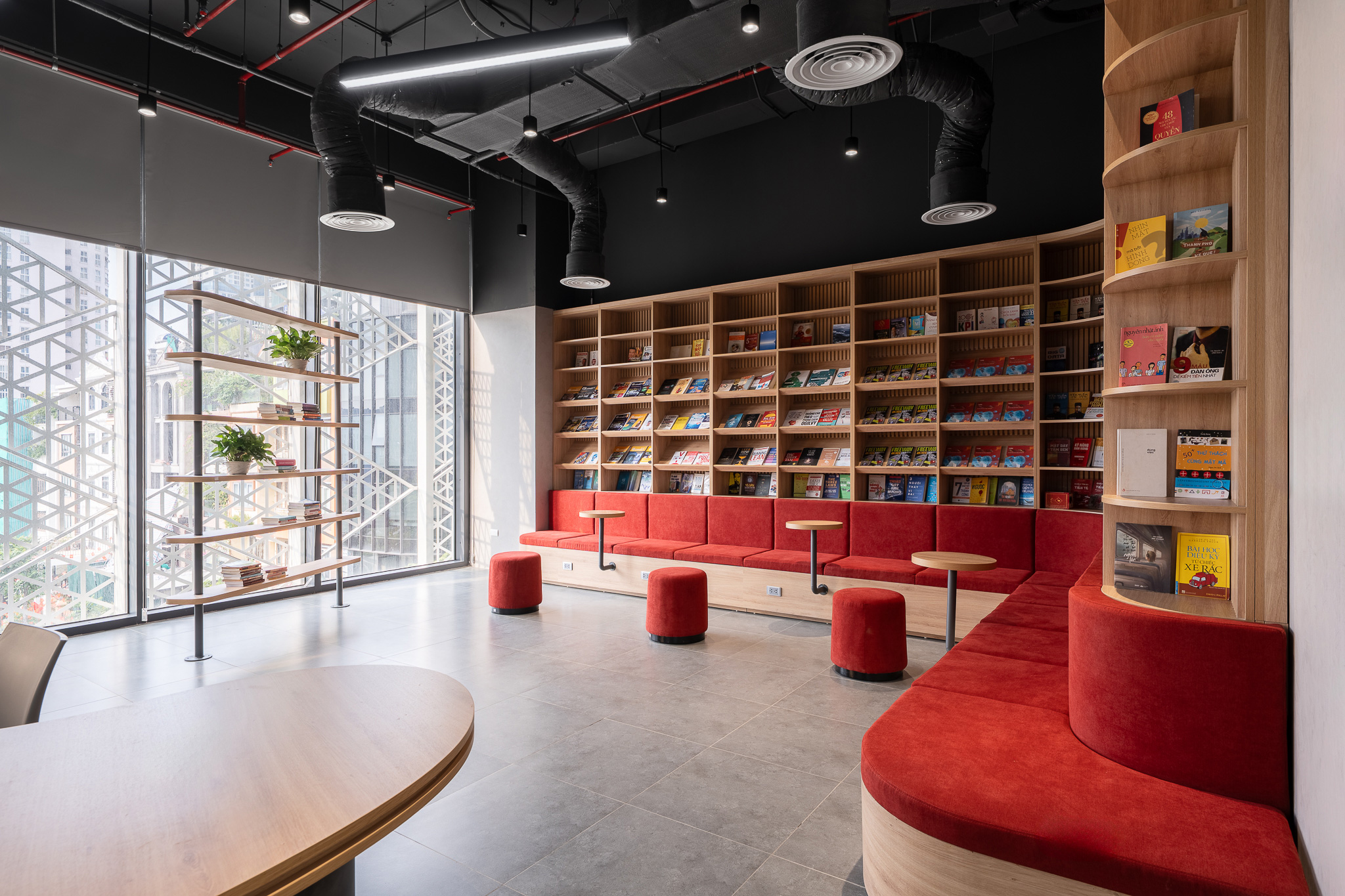 Concept nhấn mạnh sự phát triển liên tục và đồng bộ, đại diện cho một tập đoàn đa ngành công nghệ, tài chính và truyền thông hàng đầu. Hệ thống họa tiết được phát triển từ logo và cách tạo hình geometric được ứng dụng xuyên suốt trong tạo hình đồ nội thất, hệ trần, tấm tiêu âm, wayfinding tòa nhà… Sự nhắc lại các yếu tố thiết kế từ ngoại thất đến nội thất tạo nên liên kết thị giác, nhịp điệu cho không gian.