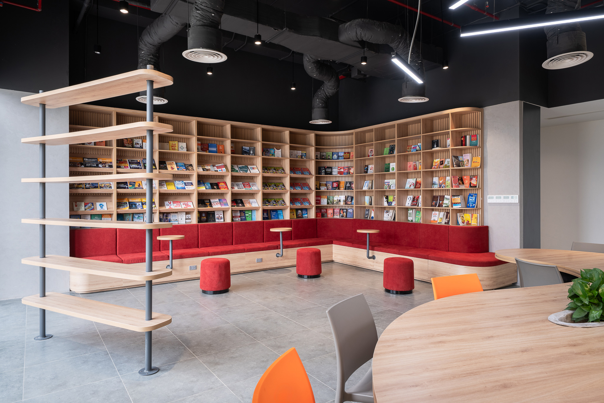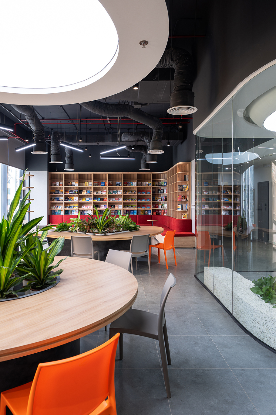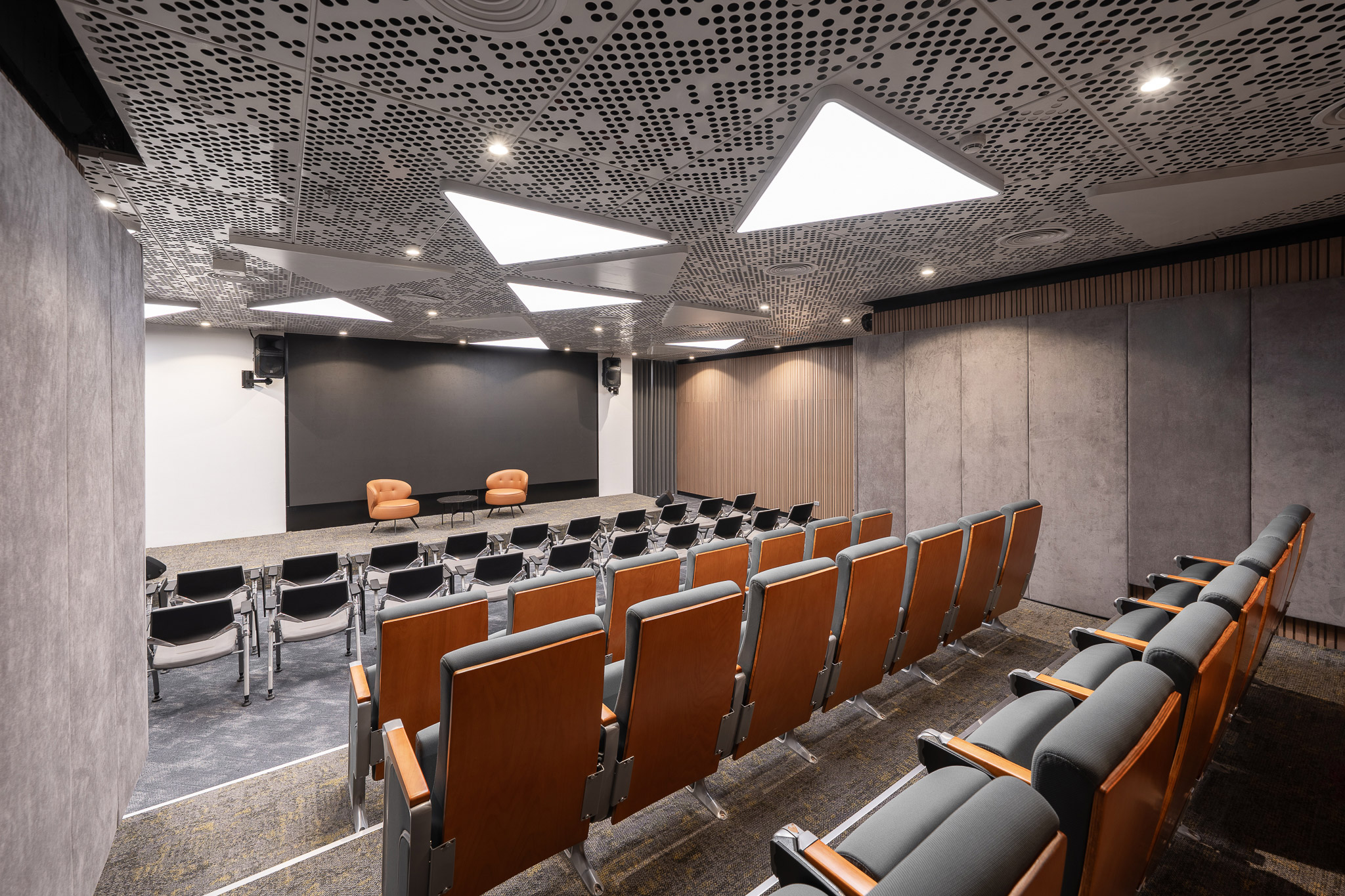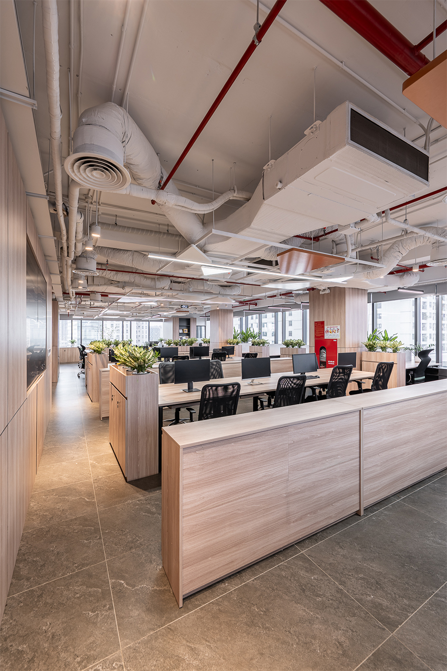 Concept nhấn mạnh sự phát triển liên tục và đồng bộ, đại diện cho một tập đoàn đa ngành công nghệ, tài chính và truyền thông hàng đầu. Hệ thống họa tiết được phát triển từ logo và cách tạo hình geometric được ứng dụng xuyên suốt trong tạo hình đồ nội thất, hệ trần, tấm tiêu âm, wayfinding tòa nhà… Sự nhắc lại các yếu tố thiết kế từ ngoại thất đến nội thất tạo nên liên kết thị giác, nhịp điệu cho không gian.
